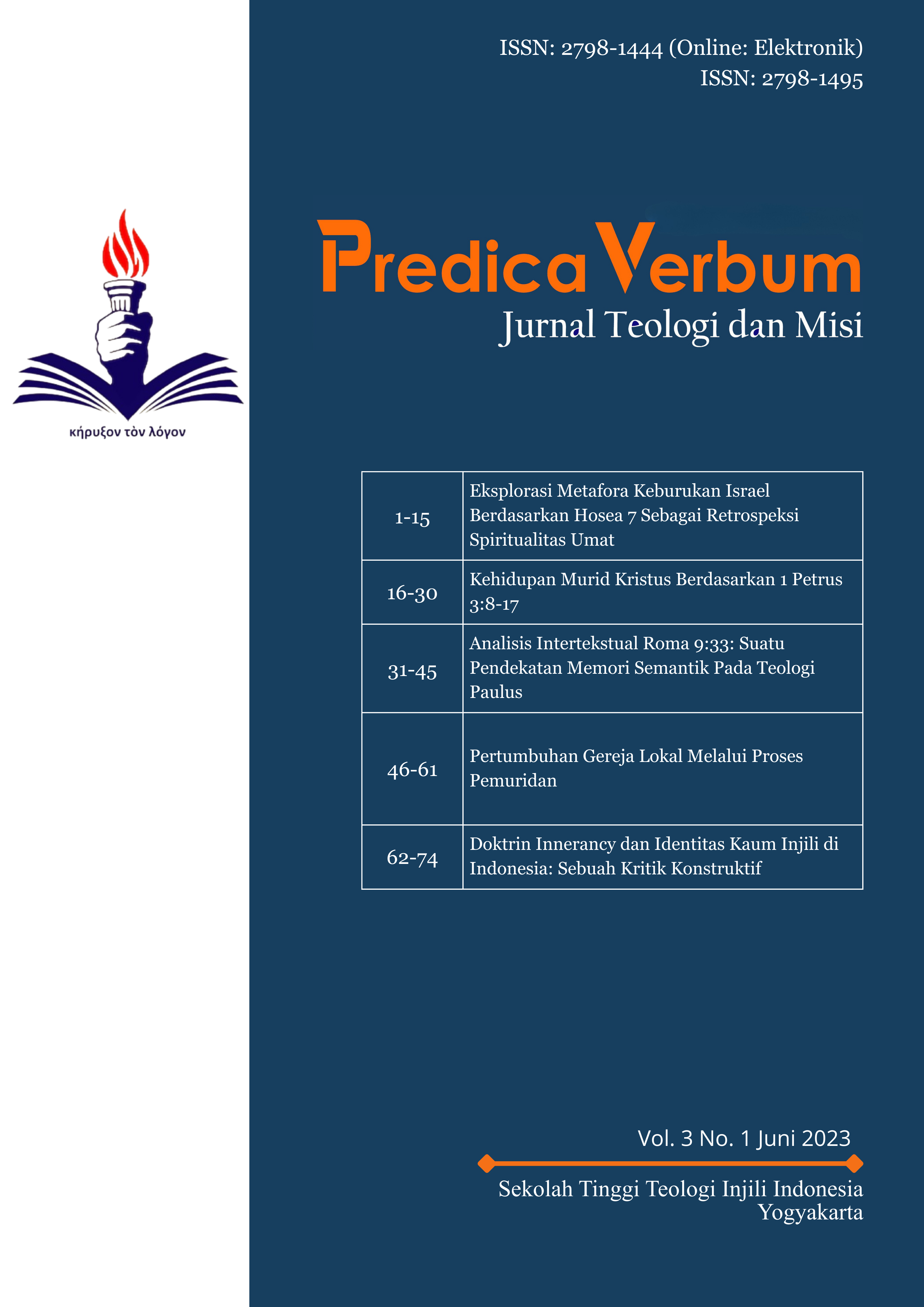 Predica Verbum is a open access peer reviewed research journal that is published by Research Institutions and Community Development Services (LPPM - STTII Yogyakarta). Predica Verbum is providing a platform that welcomes and acknowledges original research papers about Bibllical Theology, Systematic Theology and Missiology written by researchers, academicians, professionals, and practitioners from all over the world.